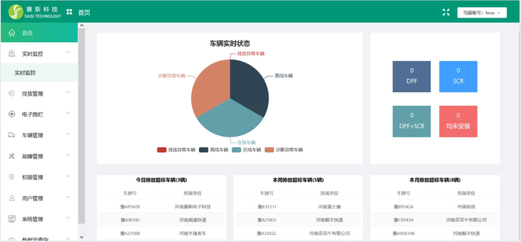 河南省赛斯电子科技有限公司重型柴油车排放在线监管平台功能丰富,包括车辆管理、用户管理、权限管理、电子围栏、系统管理、排放管理、实时监控、故障管理、数据统计分析等功能模块。